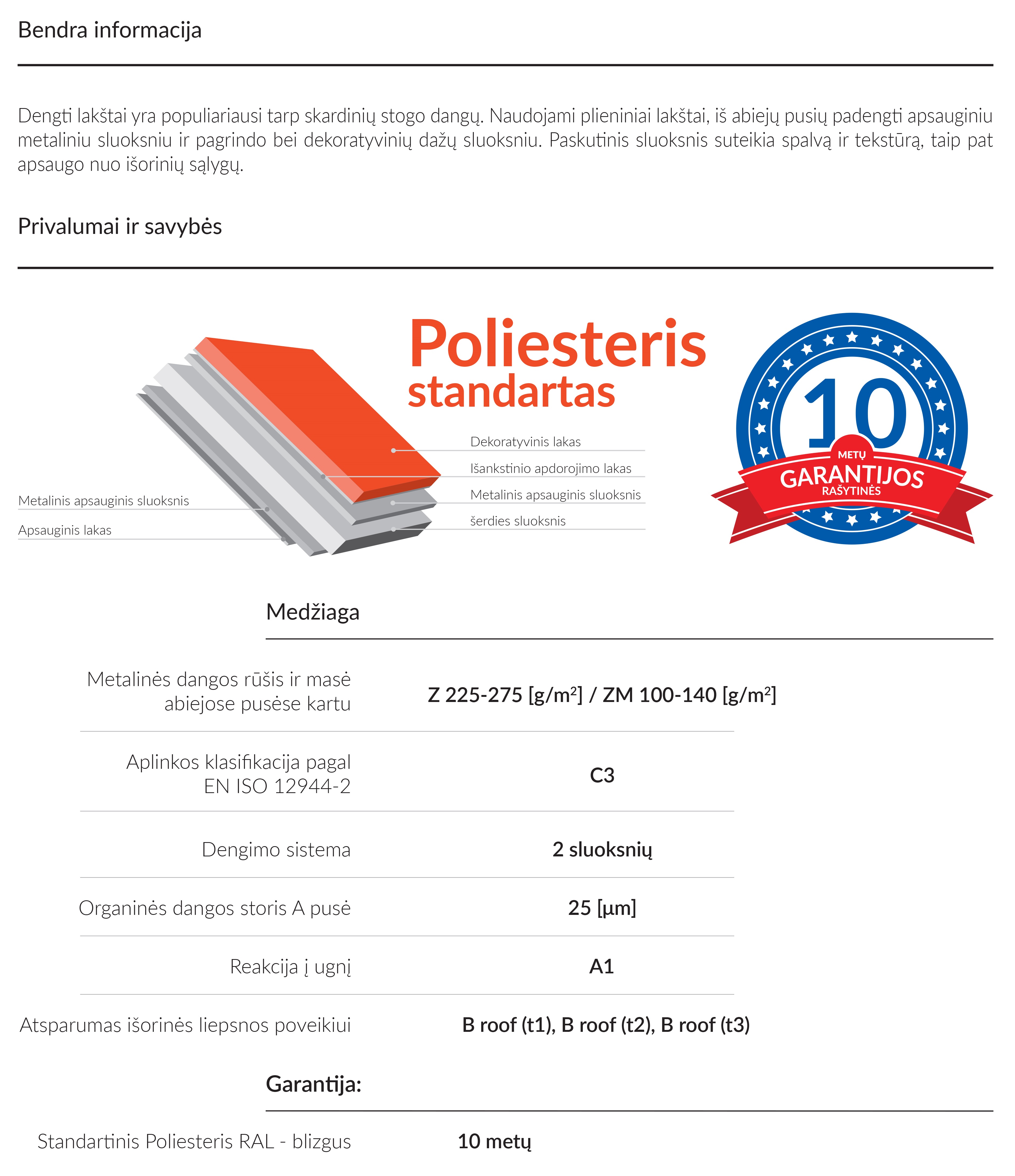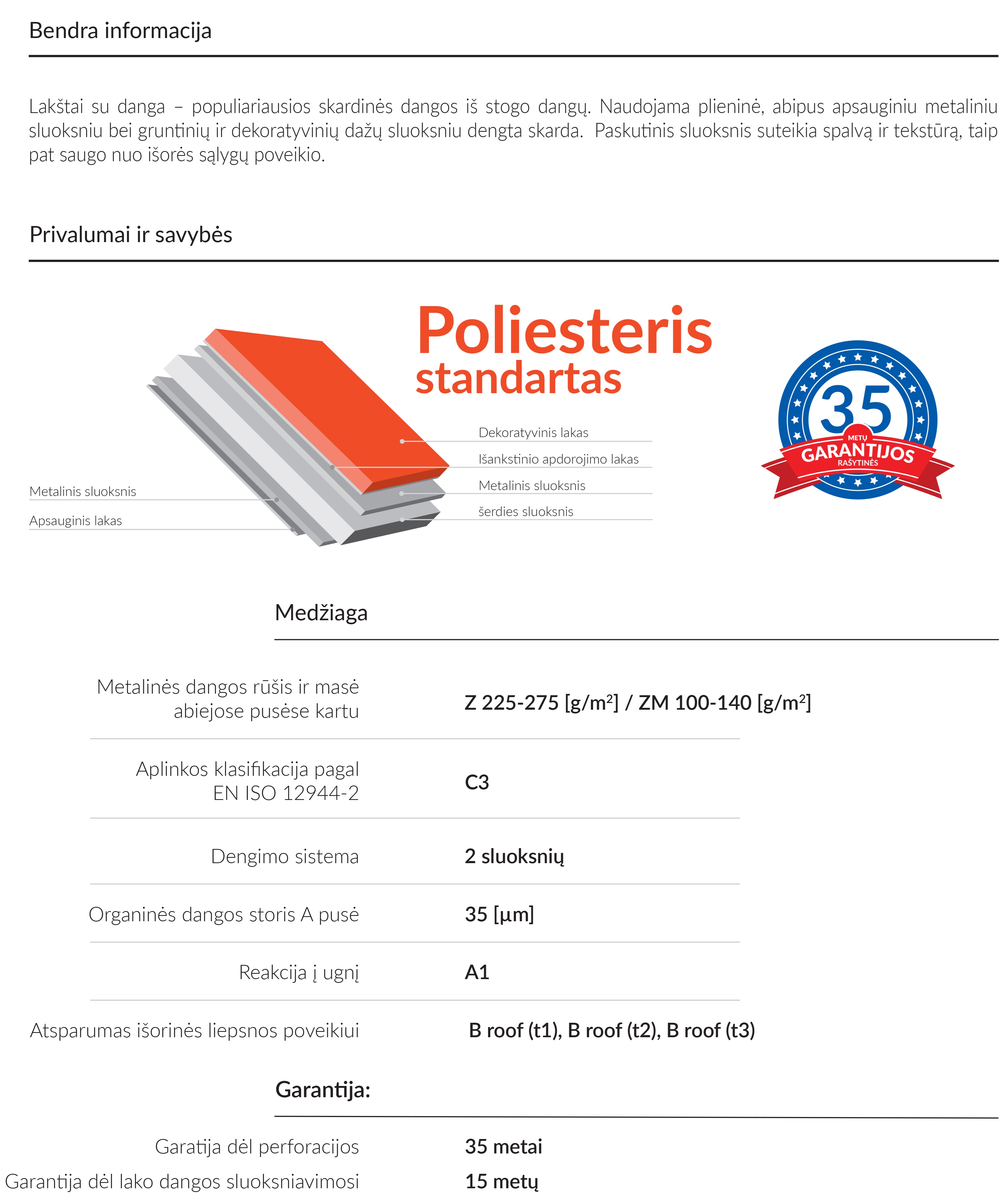 Dažyti poliesterio lakštai yra populiariausi tarp stogo dangų. Šiu metu naudojami plienio lakštai iš abiejų pusių padengiami cinku bei antikoroziniu gruntu. Paskutinis, dažų sluoksnis yra pats svarbiausias, nes jis suteikia spalvą bei struktūrą ir apsaugo nuo išorinio poveikio.