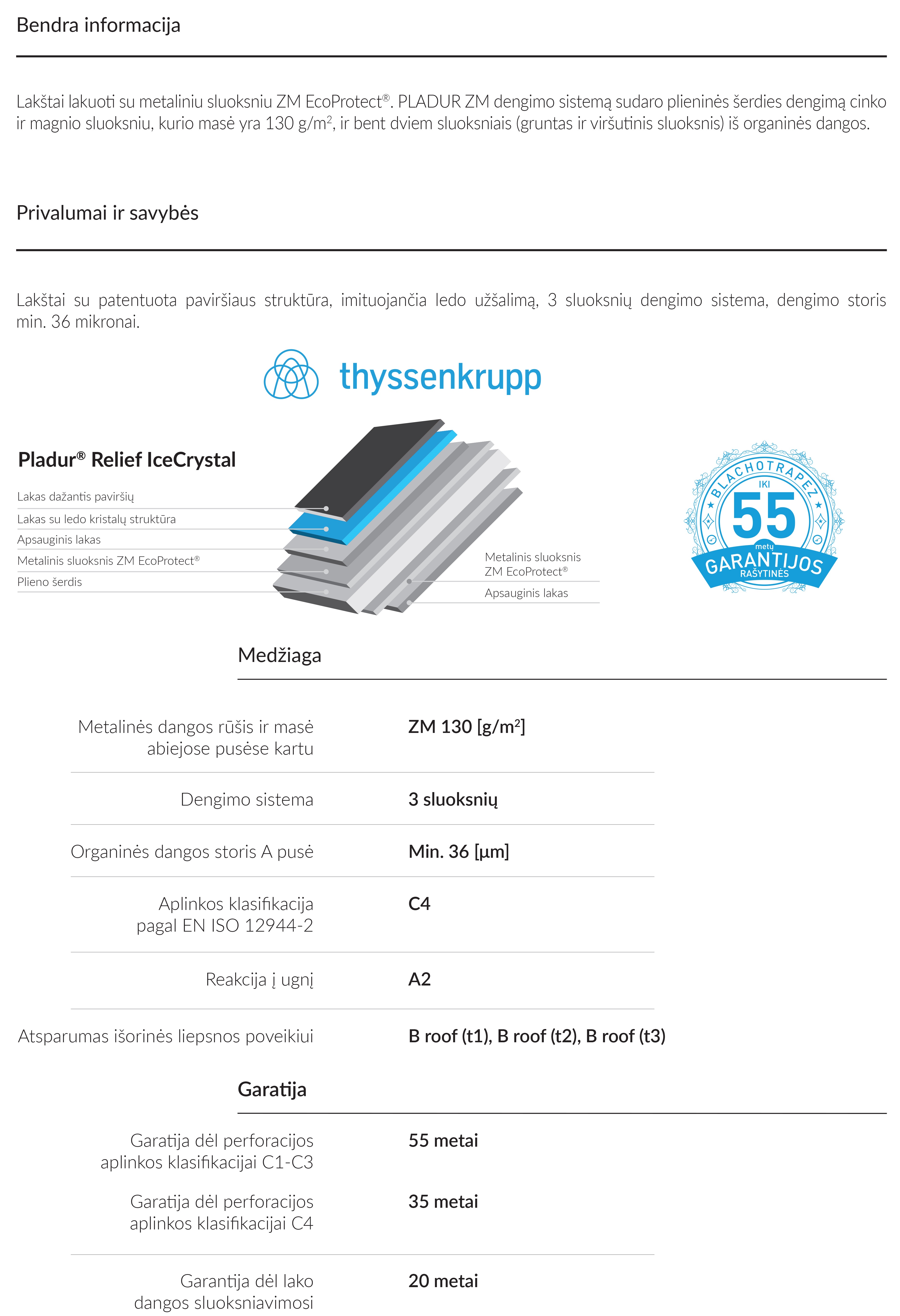 ThyssenKrupp Pladur® Relief IceCrystal - danga su unikalia paviršiaus struktūra, imituojančia šerkšną, 3-sluoksnių dažymo sistema, dažų storis minimalus 36 mikronai.