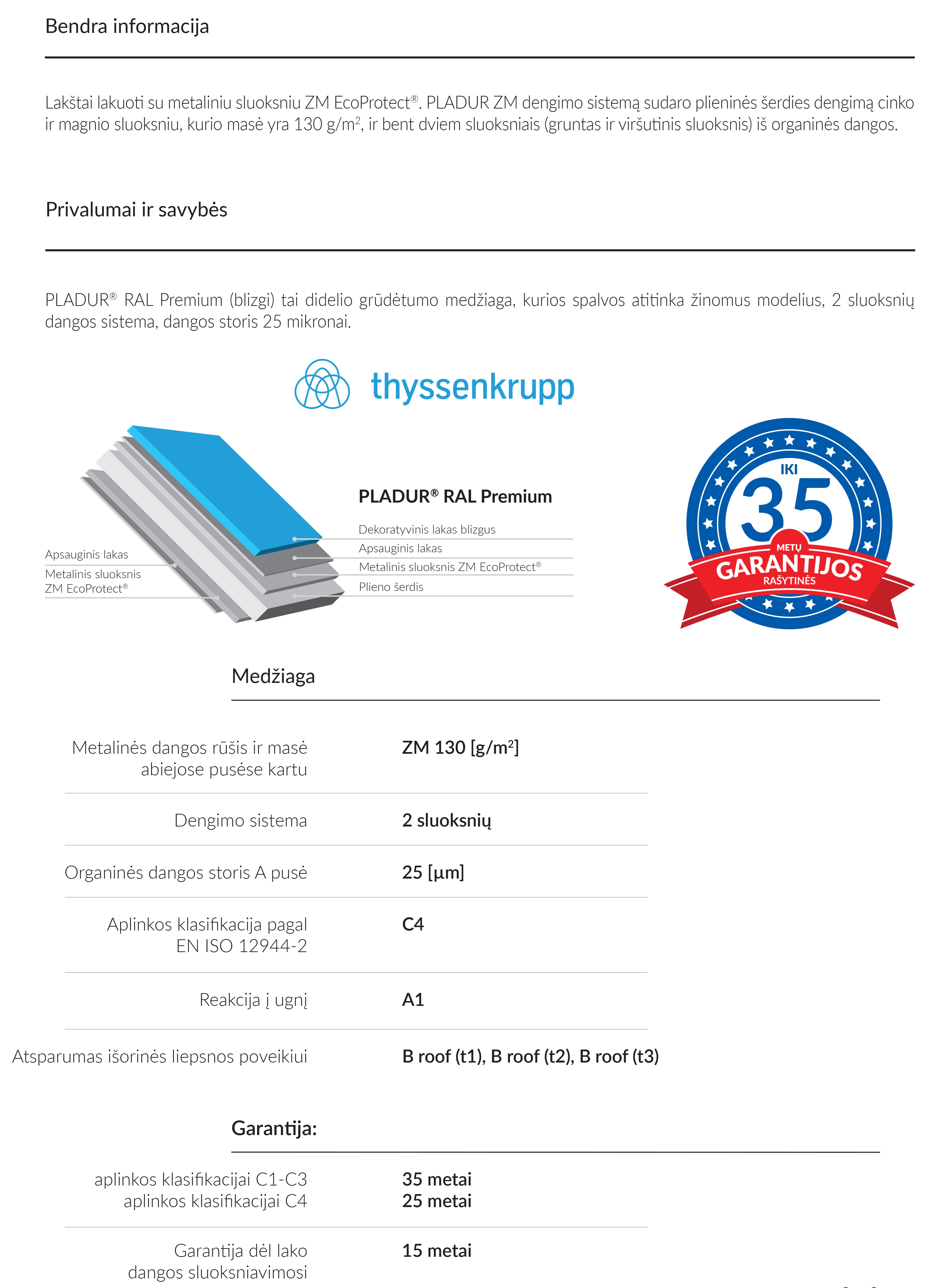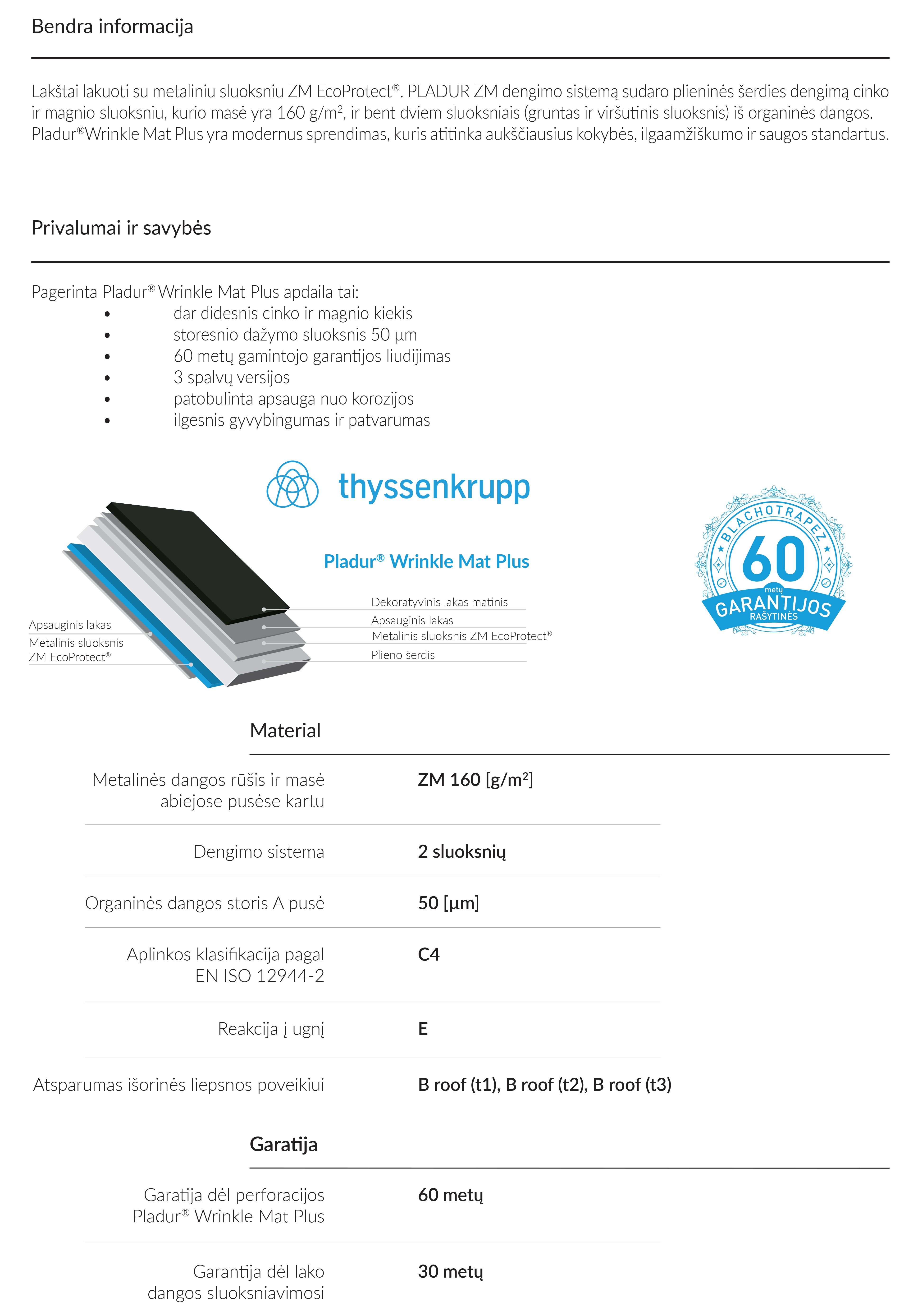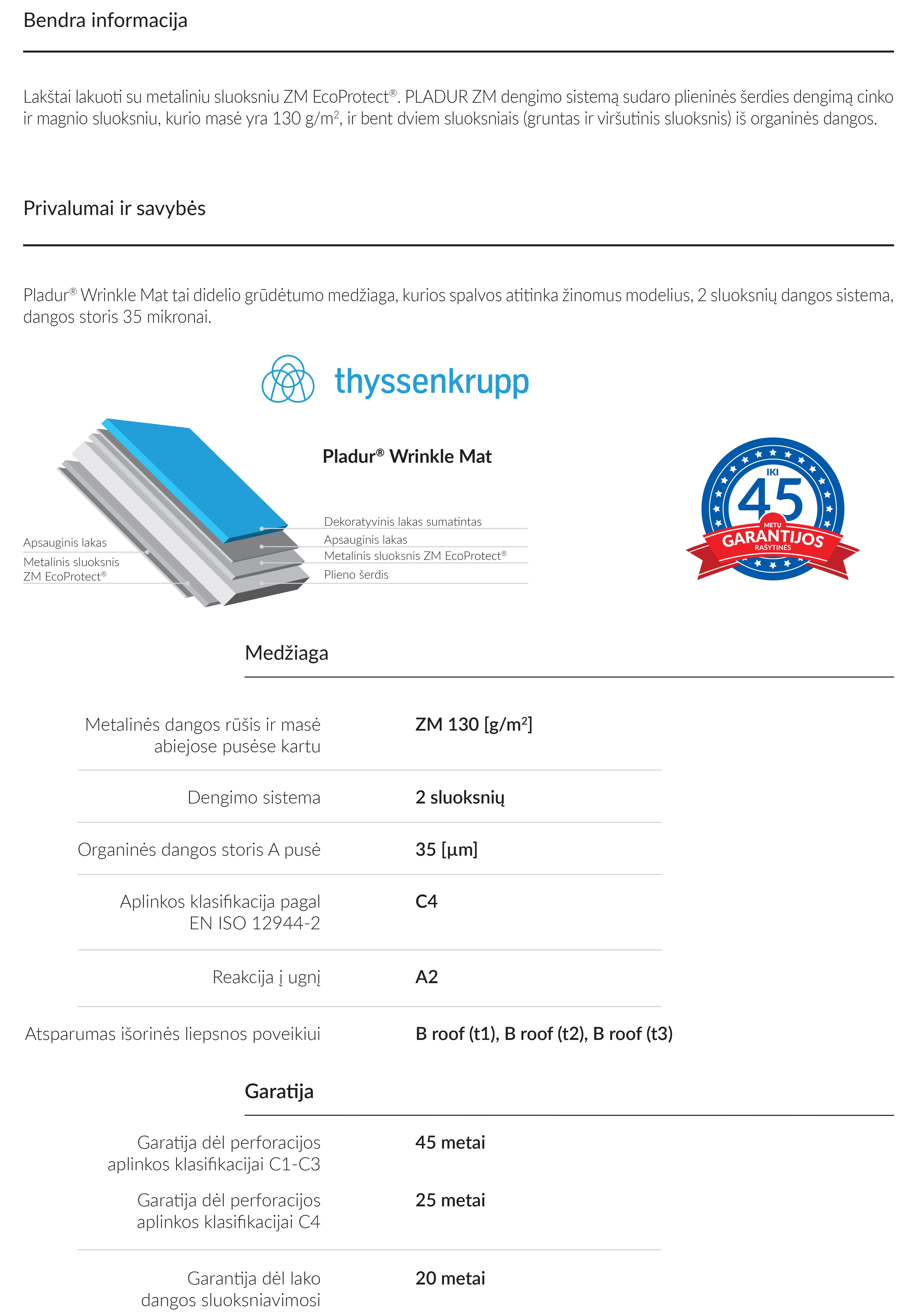 ThyssenKrupp Pladur® Wrinkle Mat Plus - Padengimas Pladur Wrinkle Mat Plus puikiai apsaugo stogo dangą, prailgina jos tarnavimo laiką, daugeliui metų užtikrina efektyviausią apsaugą nuo korozijos ir nepakitusią stogo spalvą. Pladur Wrinkle matPlus galima rinktis iš trijų matinių spalvų: juodos, rudos ir grafito.